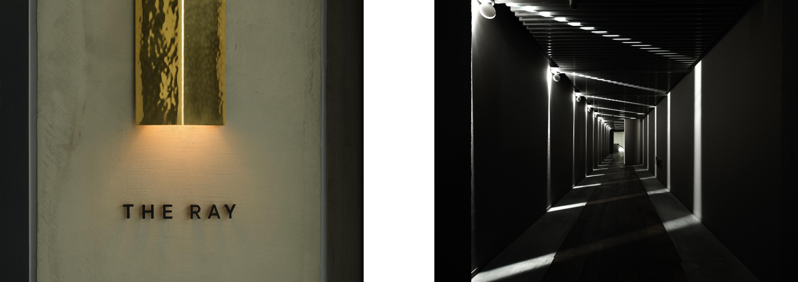 レストランまでの入口にたどり着くまでに時間がかかる問題点を活かす設計に。店舗名となっているRAY(光)を感じられるよう、色彩、照明、空間、マテリアルにおけるまで一環してコンセプトを意識して、テーブルにお客様がたどり着いて料理が出てくるまでのストーリーをデザインした。